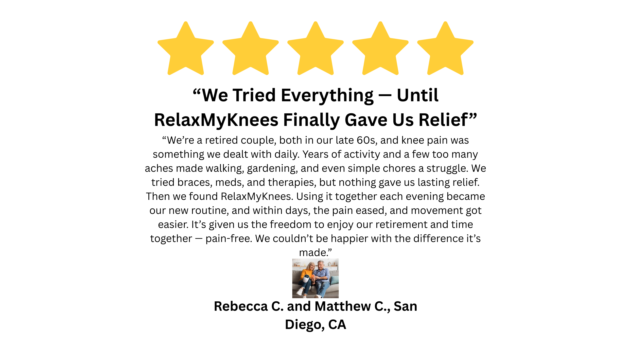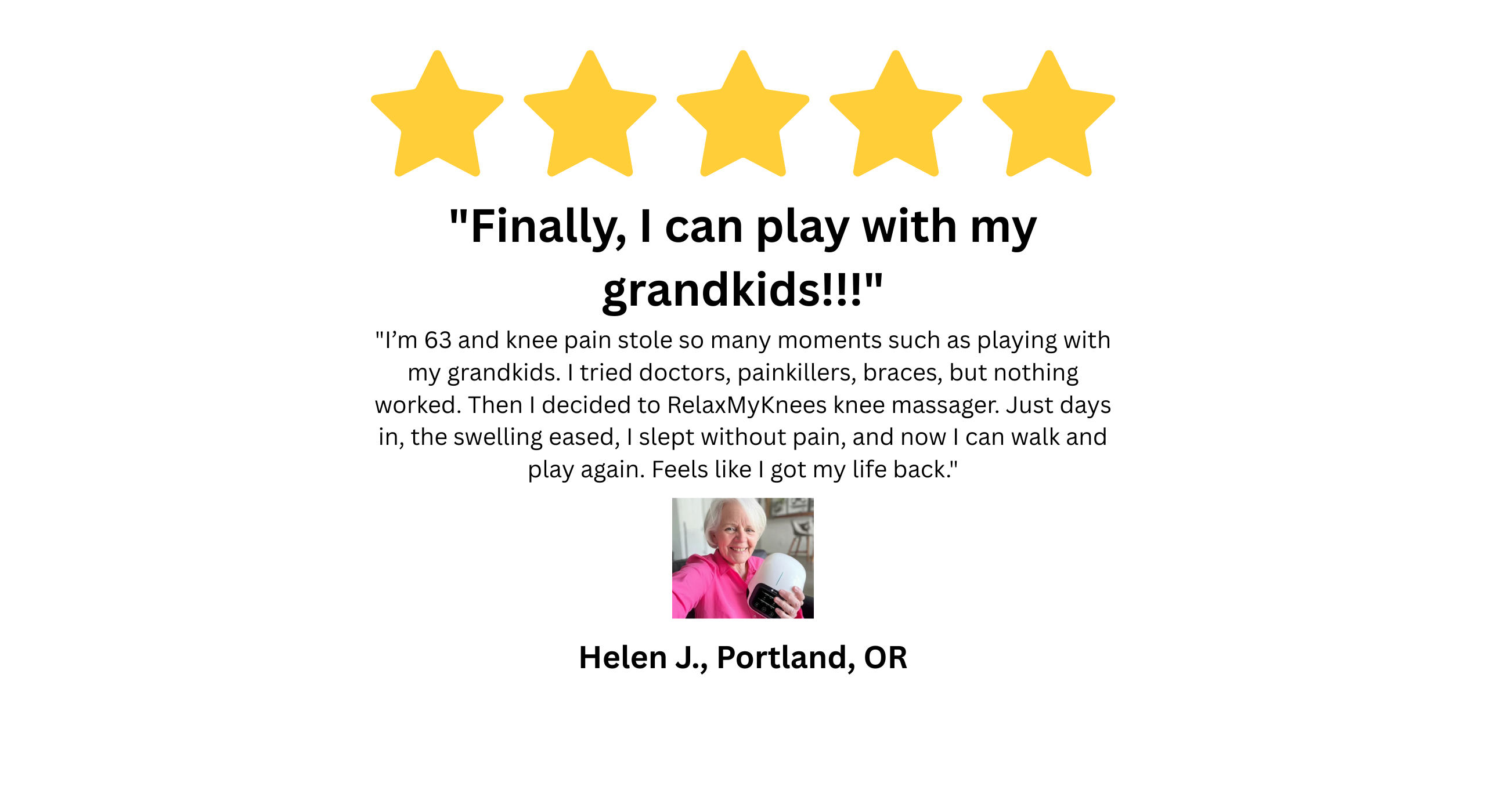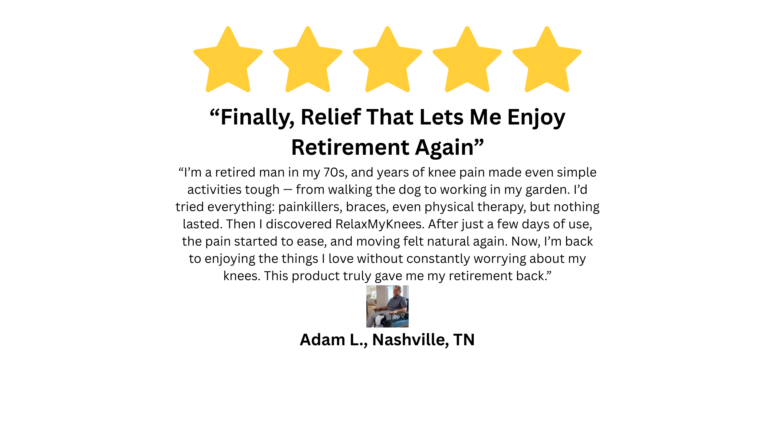 At RelaxMyKnees™, we believe no one should have to miss life’s most important moments because of knee pain. Our journey began when a loved one was told the only option was surgery, but we refused to accept that as the end of the story. After searching endlessly for a safe, effective alternative, we found a solution that helped them walk, play, and smile again.
